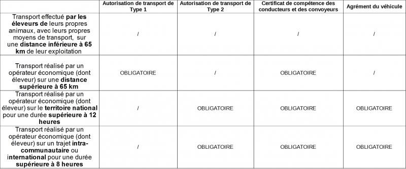 - l’autorisation du transporteur, requise pour les trajets de plus de 65 kilomètres et délivrée par la Direction Départementale de la Protection des Populations (DDPP) du département où se trouve le siège social du transporteur. Il en existe une de type 1 (durée du trajet inférieure à huit heures) et une autre de type 2 (durée du trajet supérieure à huit heures, appelé longue durée) ;